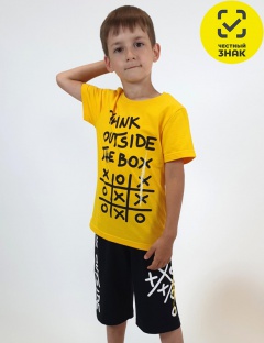 Комплект для мальчика из кулирного полотна. Футболка - прямого кроя, короткий втачной рукав, перед с печатью. Горловина обработана ластиком. Шорты - удлиненные с притачным поясом, с резинкой, без бокового шва. Печать сбоку на обеих штанинах.
