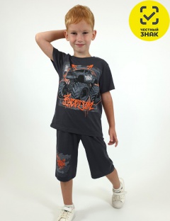 Комплект для мальчика из кулирного полотна. Футболка - прямой, короткий втачной рукав, перед с печатью. Горловина обработана ластиком. Шорты - удлиненные с притачным поясом, с резинкой. Печать на передней правой половинке.