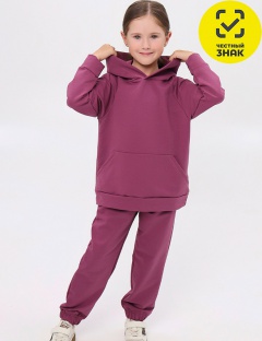 Костюм для девочки состоит из 2-х предметов. Толстовка с капюшоном, длинные втачные рукава на манжетах, накладной карман-кенгуру. Брюки на поясе и по низу на резинке.