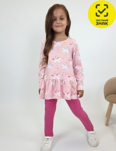 Комплект для девочки, состоящий из фуфайки и лосин. Фуфайка – силуэт трапеция, снизу волан. Рукав втачной, длинный. Горловина обработана планкой. Лосины - длинные, вверху на резинке.