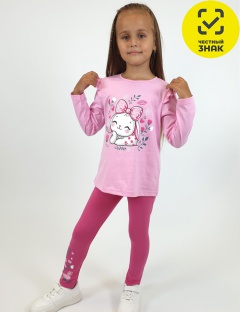 Комплект для девочки, состоящий из джемпера и лосин. Джемпер – силуэт трапеция, длинный втачной рукав, в пройме рюша. Горловина окантована, застежка на пуговицу по спинке, спереди печать. Лосины длинные, с печатью на правой стороне внизу, вверху на резинке.