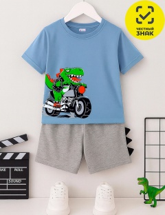 Комплект для мальчика состоит из футболки и шорт, выполненных из гладкокрашеного кулирного полотна. Футболка свободного силуэта с округлой горловиной и короткими рукавами, на полочке принт. Шорты на эластичном поясе с кулиской.
