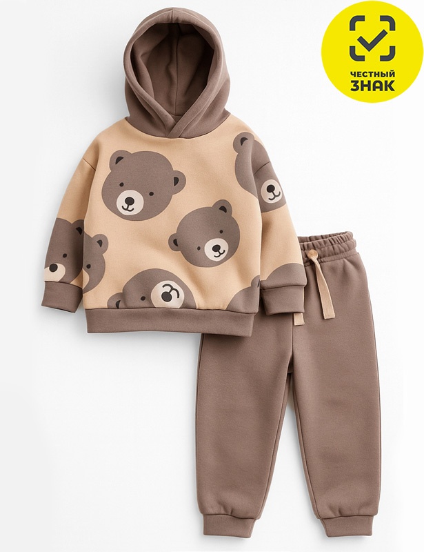 Костюм для мальчика из футера двухнитки с начесом, состоит из 2-х предметов. Джемпер декорирован принтом, с капюшоном, длинные рукава со спущенной линией плеча, с манжетами, притачной пояс по низу изделия. Брюки прямые, на поясе с кулиской и со шнуром, по нижним срезам на манжетах.