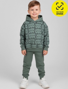 Костюм для мальчика из футера двухнитки с начесом, состоит из 2-х предметов. Джемпер декорирован принтом, с капюшоном, длинные рукава со спущенной линией плеча, с манжетами, притачной пояс по низу изделия. Брюки прямые, на поясе с кулиской и со шнуром, по нижним срезам на манжетах.