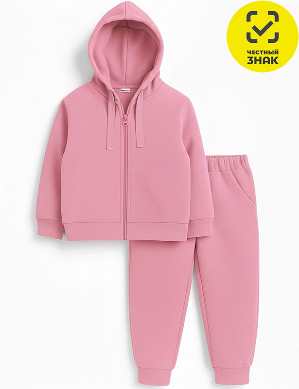 Комплект из футера двухнитки с начесом состоит из 2-х предметов. Куртка на молнии, с капюшоном на кулиске со шнуром, длинные втачные рукава с манжетами. Брюки прямые с манжетами по низу, на поясе на резинке, по бокам карманы.
