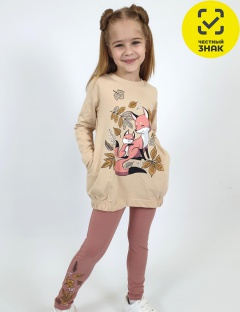 Комплект для девочки (джемпер+лосины). Джемпер свободного кроя, с печатью по переду, с двумя карманами в боковых швах. Рукав втачной, длинный. Низ изделия подшит с резинкой по боковым швам. Горловина обработана ластиком. Лосины-длинные, печать на правой передней половинке внизу. Вверху на резинке.