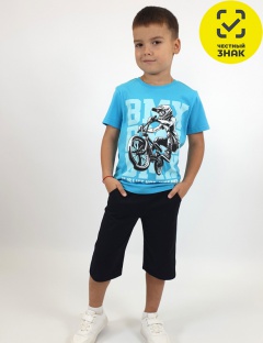 Комплект для мальчика из кулирного полотна. Футболка - прямого кроя, короткий втачной рукав, перед с печатью. Горловина обработана ластиком. Шорты-удлиненные с притачным поясом и резинкой, два кармана.
