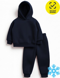 Костюм детский из футера трехнитки с начесом, состоит из 2-х предметов. Толстовка с длинными втачными рукавами на манжетах, со спущенной линией плеча, с капюшоном. Брюки на поясе на резинке, снизу на притачных манжетах.