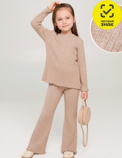 Теплый комплект для девочки из полотна в рубчик «лапша». Джемпер полуоблегающего силуэта, с длинными втачными рукавами и округлой горловиной, из подшит спиральным швом. Брюки по талии на резинке, слегка расклешенные к низу, низ подшит спиральным швом.