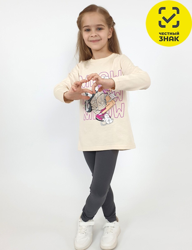 Комплект для девочки (джемпер+ лосины). Джемпер-силуэт трапеция, перед с печатью. Рукав втачной длинный. Горловина обработана ластиком, низ изделия и рукава подшиты. Лосины длинные, вверху на резинке.