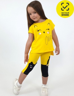 Комплект из футболки прямого силуэта с удлиненной спинкой с разрезами и принтом на передней части, спущенным плечом, окантованной и подшитой горловиной, и укороченных лосин с подрезами на передних половинках, вышитой аппликацией с левой стороны, принтом на правой передней части и отделочным бантиком.
