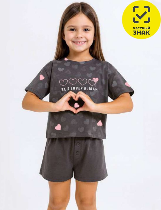 Комплект для девочки: футболка и шорты из мягкого трикотажа. Футболка из полотна в набивку "сердечки" с коротким рукавом. Горловина круглая, из рибаны. На полочке выполнена шелкография. Шорты гладкокрашеные с поясом на резинке.