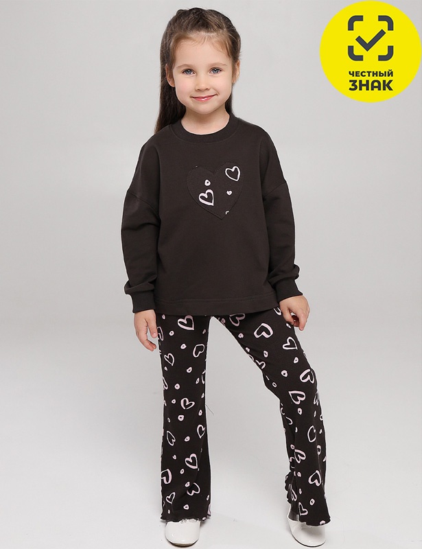 Комплект для девочки включает в себя: джемпер из футера 2х нитка петля и штаны из ткани кашкорсе. Джемпер прямого кроя с длинными втачными рукавами на манжетах, округлая горловина. На джемпере имеется нашивка в виде сердца. Штаны на поясе на резинке, расклешенные к низу.