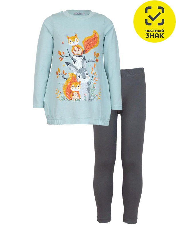 Комплект для девочки (джемпер+лосины). Джемпер свободного кроя, с печатью по переду, с двумя карманами в боковых швах. Рукав втачной, длинный. Низ изделия подшит с резинкой по боковым швам. Горловина обработана ластиком. Лосины длинные на резинке, без боковых швов.
