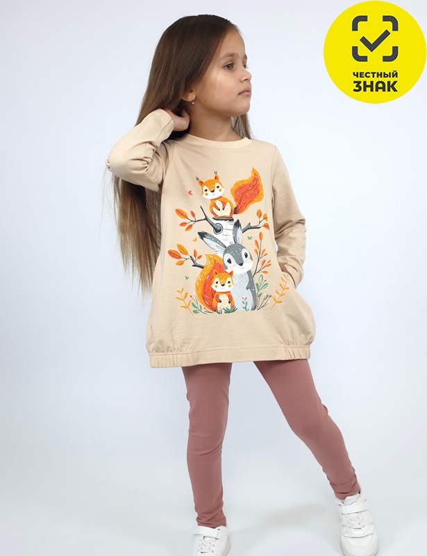 Комплект для девочки (джемпер+лосины). Джемпер свободного кроя, с печатью по переду, с двумя карманами в боковых швах. Рукав втачной, длинный. Низ изделия подшит с резинкой по боковым швам. Горловина обработана ластиком. Лосины длинные на резинке, без боковых швов.