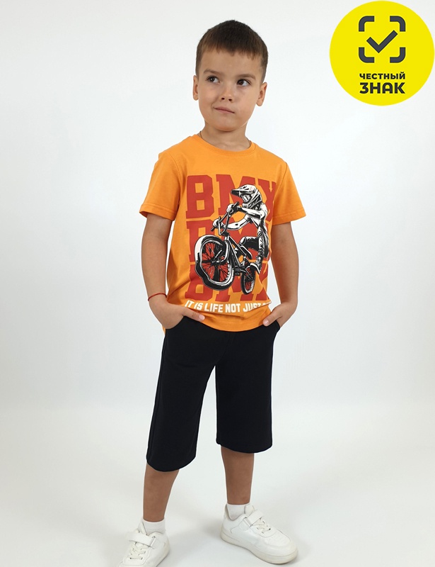 Комплект для мальчика из кулирного полотна. Футболка - прямого кроя, короткий втачной рукав, перед с печатью. Горловина обработана ластиком. Шорты-удлиненные с притачным поясом и резинкой, два кармана.
