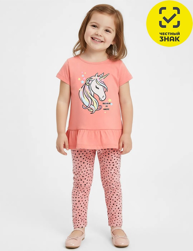 Комплект для девочки состоит из 2-х предметов. Футболка из гладкокрашеного полотна, прямого кроя, по низу декорирована баской, с короткими втачными рукавами, округлая горловина, застежка на кнопки по плечу. Лосины из набивного полотна, облегающие, по талии на резинке.