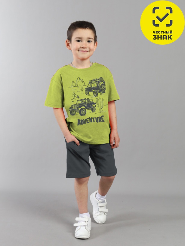 Комплект для мальчика включает футболку и шорты. Футболка классического кроя, с коротким втачным рукавом, горловиной, обработанной притачной бейкой, спереди декорирована принтом. Шорты изготовлены из кулирной глади повышенной плотности, верх шорт обработан притачным поясом из основного полотна и эластичной резинкой внутри, в пояс вставлен функциональный шнурок. На передних половинках расположен карман.