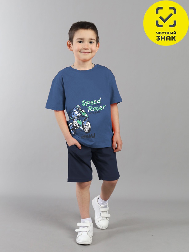 Комплект для мальчика включает футболку и шорты. Футболка классического кроя, с коротким втачным рукавом, горловиной, обработанной притачной бейкой, спереди декорирована принтом. Шорты изготовлены из кулирной глади повышенной плотности, верх шорт обработан притачным поясом из основного полотна и эластичной резинкой внутри, в пояс вставлен функциональный шнурок. На передних половинках расположен карман.