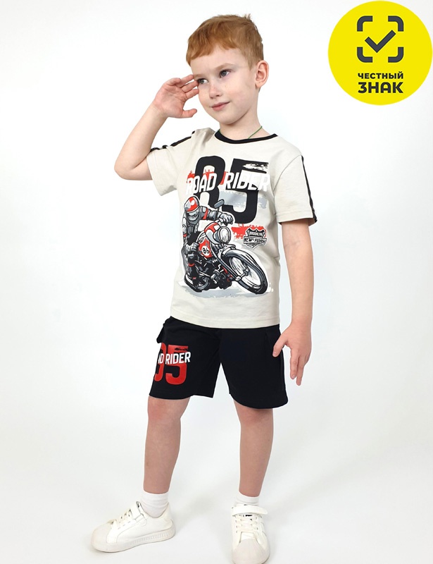 Комплект для мальчика (футболка+шорты). Футболка-прямая, короткий втачной рукав, перед и рукава с печатью. Горловина обработана ластиком. Шорты - удлиненные, притачной пояс с резинкой. Два накладных кармана с клапаном сбоку. Печать на правой передней половинке шорт внизу.