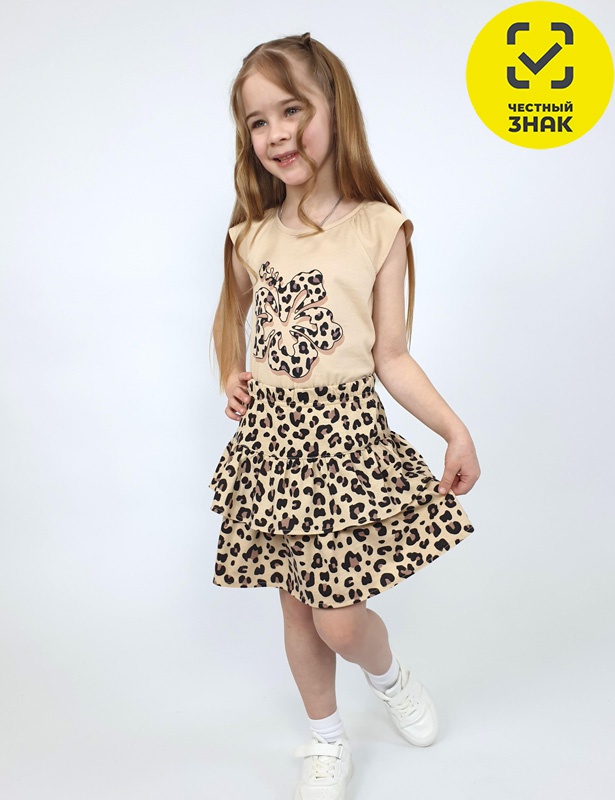 Комплект для девочки (джемпер+ юбка). Джемпер-полуприлегающего силуэта, перед с печатью. Рукав короткий "крылышко". Горловина окантована. Юбка-на кокетке с резинкой и двумя рюшами.