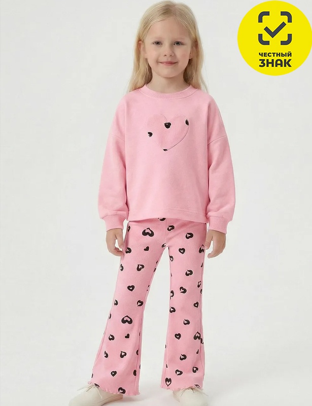 Комплект для девочки включает в себя: джемпер из футера 2х нитка петля и штаны из ткани кашкорсе. Джемпер прямого кроя с длинными втачными рукавами на манжетах, округлая горловина. На джемпере имеется нашивка в виде сердца. Штаны на поясе на резинке, расклешенные к низу.