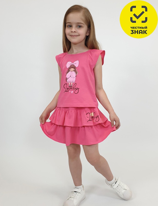 Модный комплект для девочки состоит из укороченной футболки прямого силуэта. Особенность модели - рукав реглан со сборкой, что придает изделию особый шарм. Горловина аккуратно окантована, а на передней части футболки нанесена декоративная печать. К футболке комплектуется юбка с кокеткой, украшенная двумя рюшами. На передней части верхнего рюша с левой стороны расположена изящная печать.