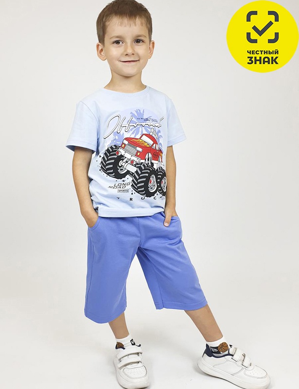 Комплект для мальчика состоит из 2-х предметов. Футболка прямая с печатью, короткий втачной рукав. Горловина обработана ластиком. Шорты удлиненные с притачным поясом и резинкой. Два кармана на переде.