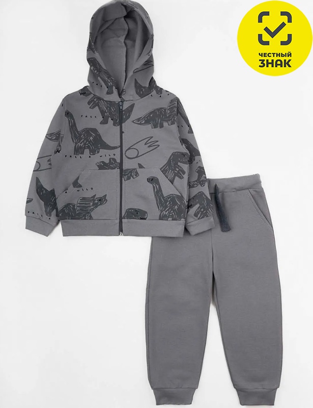 Комплект из футера двухнитки с начесом состоит из 2-х предметов. Куртка с капюшоном, длинные втачные рукава с манжетами, накладной карман-кенгуру. Брюки прямые с манжетами по низу, на поясе на резинке со шнуром, по бокам карманы.