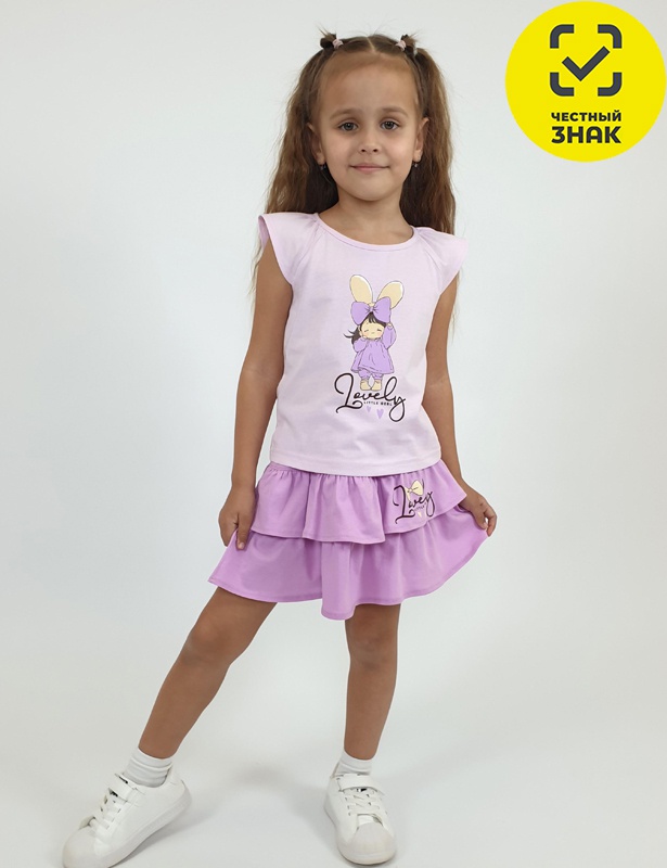 Модный комплект для девочки состоит из укороченной футболки прямого силуэта. Особенность модели - рукав реглан со сборкой, что придает изделию особый шарм. Горловина аккуратно окантована, а на передней части футболки нанесена декоративная печать. К футболке комплектуется юбка с кокеткой, украшенная двумя рюшами. На передней части верхнего рюша с левой стороны расположена изящная печать.