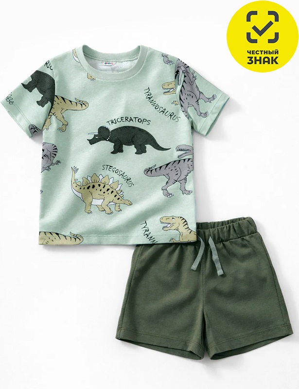 Комплект для мальчика состоит из 2-х предметов. Футболка из набивного полотна, короткие втачные рукава, округлая горловина с застежкой на кнопки. Шорты из гладкокрашеного полотна, на поясе на резинке.