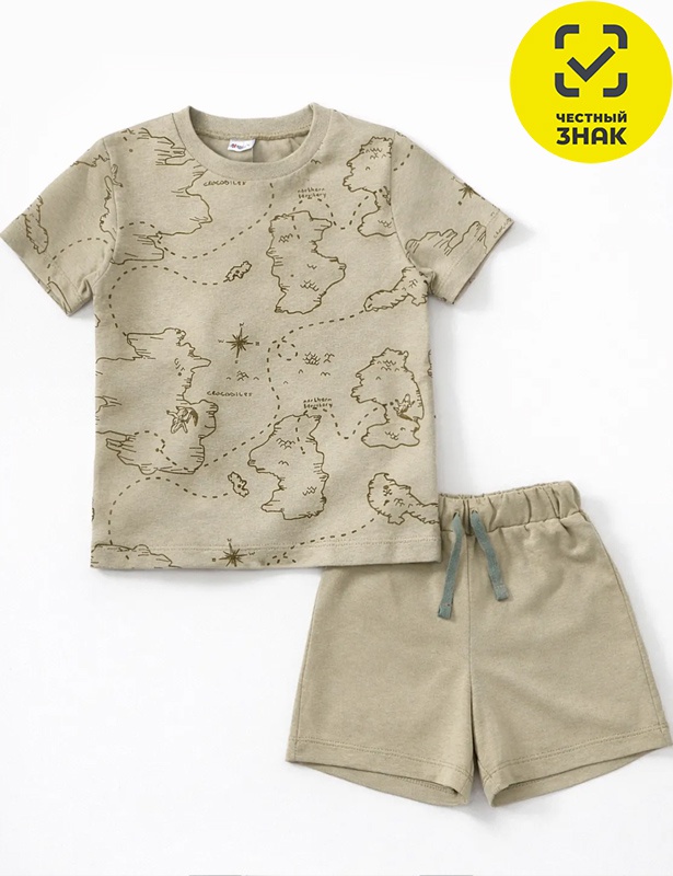 Комплект для мальчика состоит из 2-х предметов. Футболка из набивного полотна, короткие втачные рукава, округлая горловина с застежкой на кнопки. Шорты из гладкокрашеного полотна, на поясе на резинке.