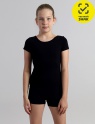 Купальник с коротким рукавом и нижней частью в виде шорт, задняя половинка с центральным швом, вырез горловины окантован бейкой из основного полотна.