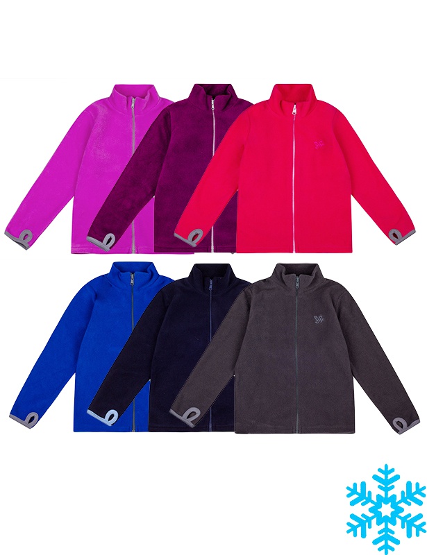Куртка из гладкокрашеного флиса на молнии, горловина-стойка, удлинённые рукава с прорезями для больших пальцев защищают маленькие запястья от холода, на полочке небольшая вышивка.