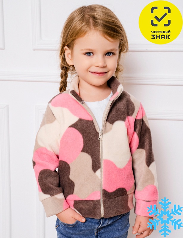 Куртка из теплого и мягкого набивного флиса на молнии, с длинными втачными рукавами на манжетах, воротником-стойкой.
