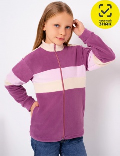 Куртка из теплого и мягкого флиса, выполнена комбинированием полотен разных цветов, с длинными втачными рукавами с манжетами, центральная застежка на молнию, воротник-стойка.
