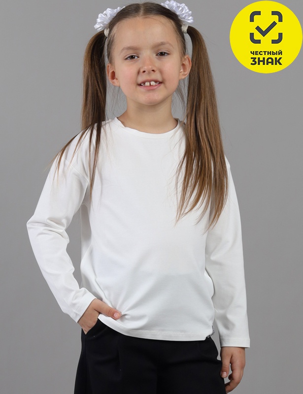 Джемпер свободного силуэта для девочки со спущенным плечом и длинными рукавами . Воротник из основного полотна. Спереди декоративная жаккардовая этикетка.