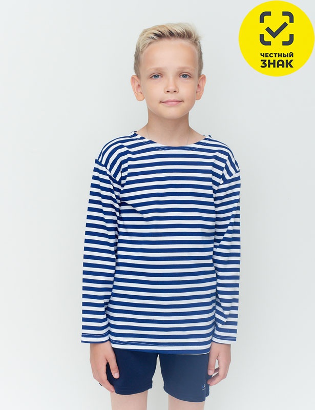 Фуфайка-тельняшка для мальчика с длинным рукавом, округлой горловиной из трикотажа в полоску.
