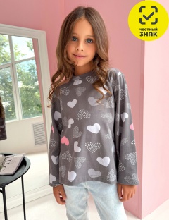 Лонгслив для девочки: из мягкого трикотажа из набивного плотна "сердечки". Лонг с длинным рукавом. Горловина круглая. Низ изделия по спинке закругленный и немного длинее переда.
