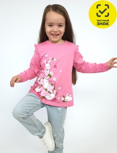 Джемпер для девочки - силуэт трапеция, длинный втачной рукав, в пройме рюша. Горловина окантована, застежка на пуговицу по спинке. Печать на переде.