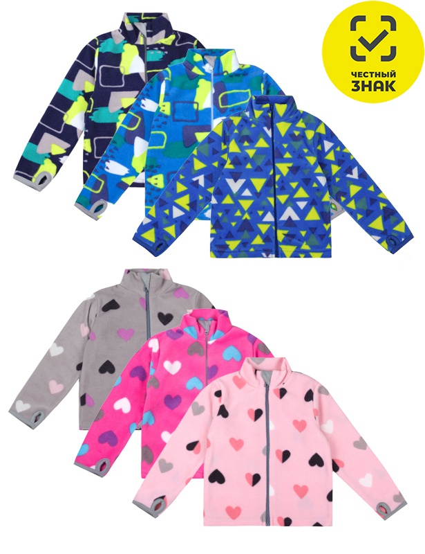Куртка детская выполнена из набивного флиса, на молнии, горловина-стойка, удлинённые рукава с прорезями для больших пальцев защищают запястья от холода.