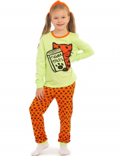 Пижама из кулирного полотна состоит из 2-х предметов: джемпер и брюки. Джемпер прямого кроя, втачные длинные рукава на манжетах, округлый вырез горловины, обработанный ластиком, на полочке принт. Брюки на манжетах, на поясе на резинке.
