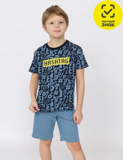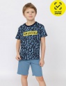 Пижама комбинированная из футболки и шорт. Футболка набивная, свободного покроя с коротким рукавом. Горловина обработана притачной бейкой из рибаны с лайкрой. Перед оформлен принтом. Шорты свободного покроя длиной ниже колена выполнены из гладкокрашеного полотна. Цельнокроенный пояс обработан плоским швом вподгибку с одновременным прокладыванием резинки.