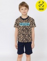 Пижама комбинированная из футболки и шорт. Футболка набивная, свободного покроя с коротким рукавом. Горловина обработана притачной бейкой из рибаны с лайкрой. Перед оформлен принтом. Шорты свободного покроя длиной ниже колена выполнены из гладкокрашеного полотна. Цельнокроенный пояс обработан плоским швом вподгибку с одновременным прокладыванием резинки.