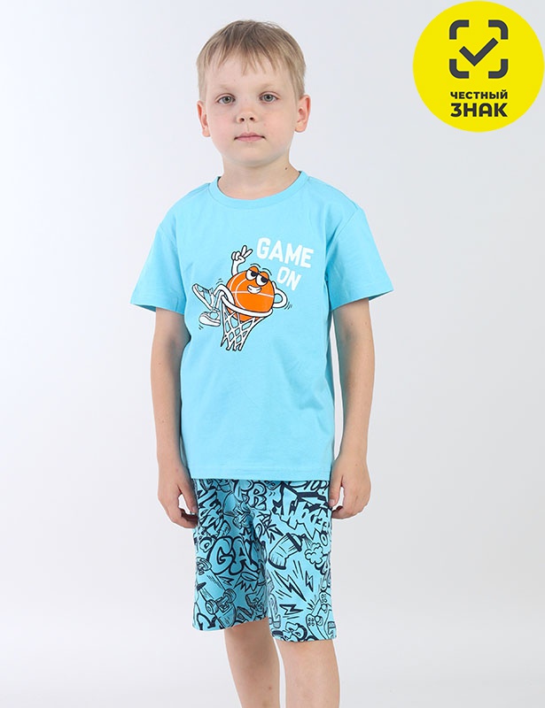 Комплект для мальчика. Футболка свободного силуэта с круглым воротником из эластичной рибаны и втачным рукавом. Перед декорирован принтом. Шорты набивные, свободные, длиной выше колена.