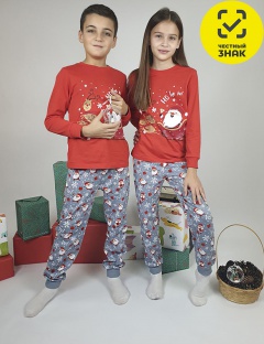 Пижама для мальчика. Джемпер прямой, рукав втачной, длинный на манжете из ластика. Горловина обработана ластиком. Печать на переде. Брюки длинные из набивного полотна. Верхний срез подшит с резинкой.