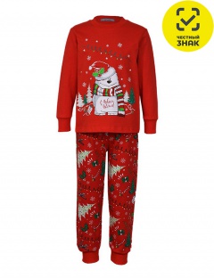 Новогодняя пижама для мальчика. Джемпер -прямой, рукава втачные, длинные на манжете из ластика. Печать на переде. Горловина обработана ластиком. Брюки - длинные прямые, верхний срез подшит с резинкой.