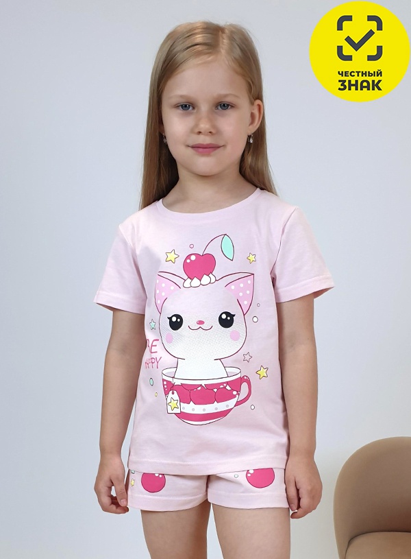 Пижама для девочки. Футболка пижамная - прямая, рукав втачной, короткий. Горловина обработана планкой. Печать на переде. Шорты пижамные - короткие на резинке, низ подшит. Печать на передних половинках.