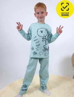 Пижама для мальчика состоит из двух предметов: джемпера и брюк. Джемпер пижамный - прямого силуэта, рукав втачной длинный на манжете из ластика. Горловина обработана ластиком. Печать спереди. Брюки пижамные - длинные, прямые. Верхний срез подшит с резинкой. Печать на передних половинках внизу.
