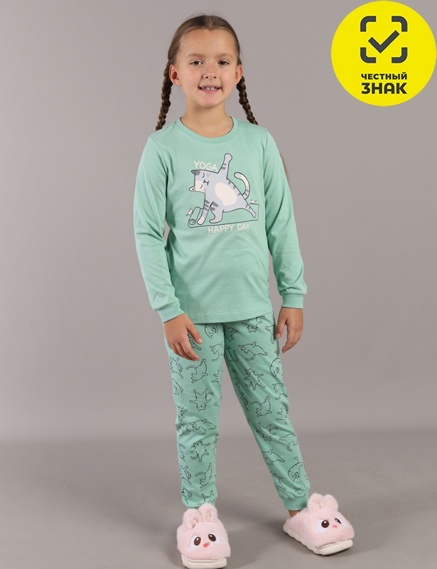 Пижама для девочки: джемпер и брюки из мягкого трикотажа. Джемпер с длинным рукавом на манжете из рибаны. Горловина круглая, из рибаны. На полочке выполнена шелкография. Брюки с поясом на резинке и манжетами по низу из рибаны. Полотно с набивным рисунком.